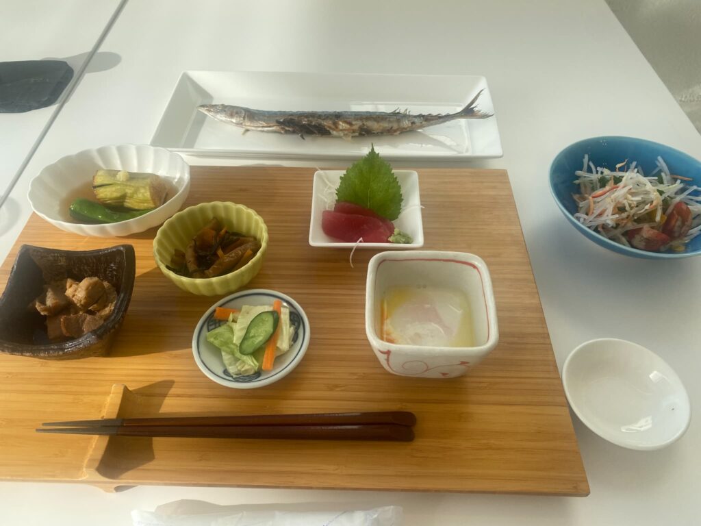 お刺身や煮物、秋刀魚の塩焼き、サラダ、温泉卵など…